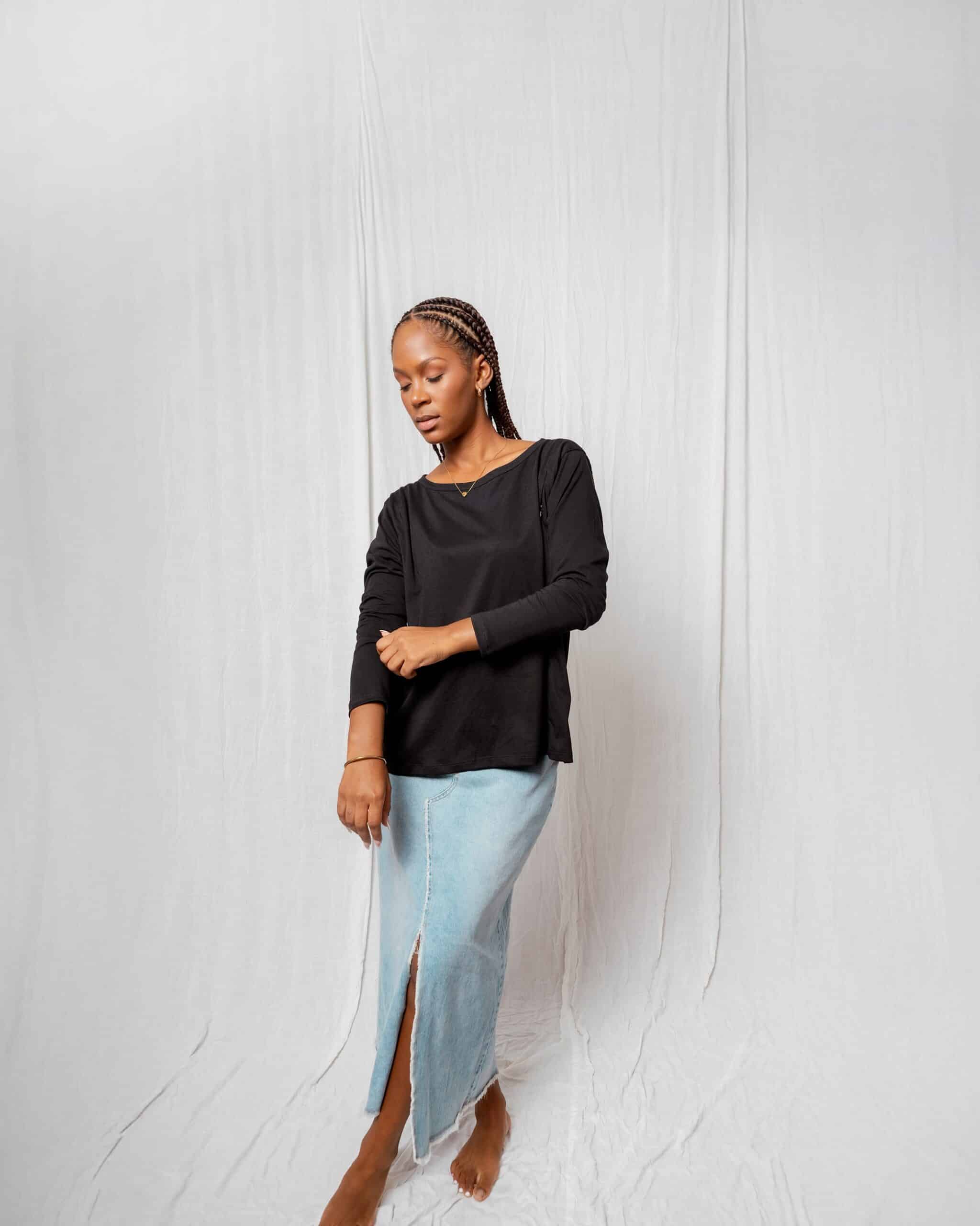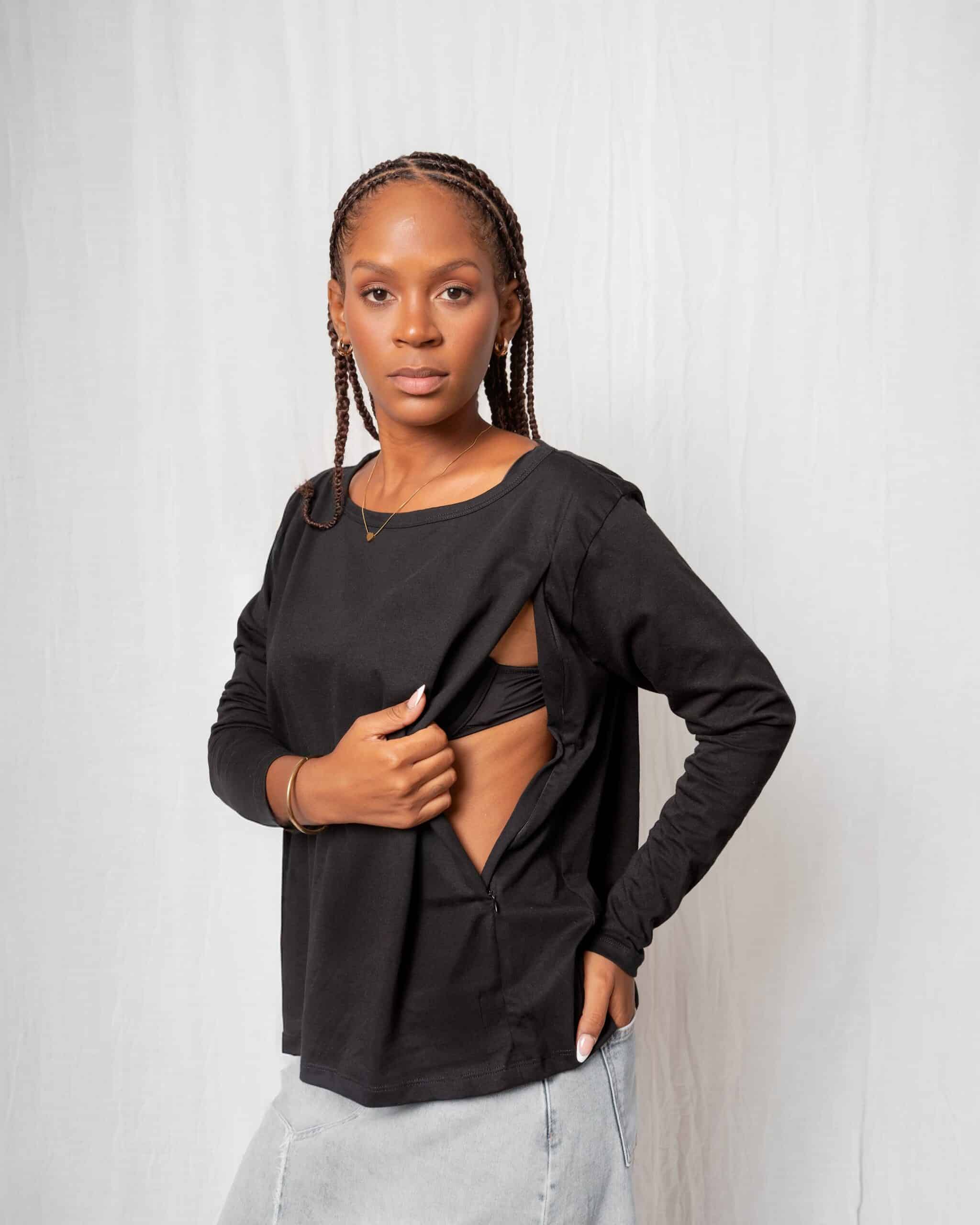 Polera negra de manga larga, Comodidad desde el embarazo hasta la lactancia. Con calce más amplio en la parte baja, ideal para tu guatita de embarazo y más comodidad postparto.